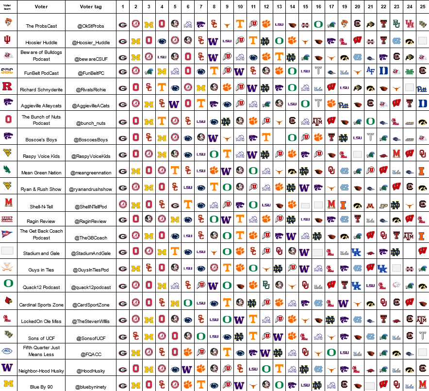 | Go Big Redcast | Georgia | Ohio State | Alabama | Clemson | Texas | Michigan | Texas A&M | LSU | Penn State | Tennessee | USC | Florida State | Utah | Ole Miss | Florida | Oregon | Washington | Notre Dame | Oklahoma | Iowa | Miami | UNC | Wisconsin | Auburn | Kansas State |