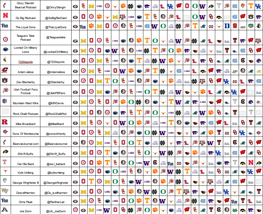 | The Spurs Up Show | Georgia | Ohio State | Florida State | Alabama | Michigan | LSU | Penn State | USC | TCU | Washington | Oregon | Tennessee | Notre Dame | Utah | Texas | Kansas State | Ole Miss | Oregon State | South Carolina | Tulane | UNC | Texas Tech | Iowa | Clemson | UTSA |